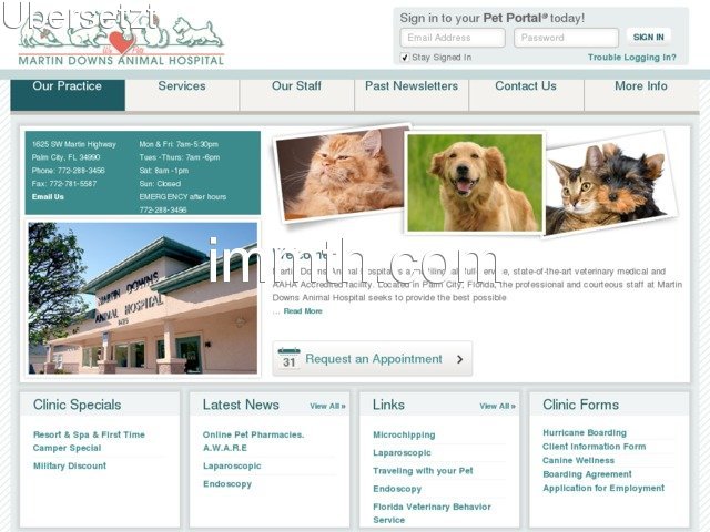 Martin Downs Animal Hospital, Palm City, FL 34990 | Tierarzt - Martin Downs Animal Hospital ist eine Mehrsprachige full-service-Stand der Technik Veterinär-medizinischen und AAHA Akkreditierten Einrichtung, befindet sich in Palm City, FL. Das professionelle und zuvorkommende Personal an der Martin-Downs Animal Hospital versucht, die bestmögliche medizinische Versorgung, chirurgische Versorgung und zahnärztliche Versorgung für Ihre hoch geschätzten Patienten. Wir sind verpflichtet, zur Förderung einer verantwortungsvollen Heimtierhaltung, Gesundheitsvorsorge und gesundheitsbezogene Bildungschancen für unsere Kunden. Martin Downs Animal Hospital ist bestrebt, bieten Exzellenz in der veterinärmedizinischen Versorgung zum Palm City, FL und Umgebung. Bitte nehmen Sie sich einen moment Zeit, um uns zu Kontaktieren heute, um mehr zu erfahren über unsere tierärztliche Praxis und erfahren Sie mehr Informationen darüber, wie Martin Downs Animal Hospital dienen kann, die Bedürfnisse von Ihnen und Ihren geliebten Haustier.